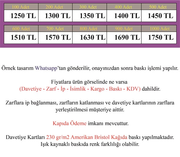 Göndermiş olduğunuz bilgilerle davetiyeniz tasarlanıp size tasarım Whatapp üzerinden gönderilecektir. Onayınız olmadan davetiyeniz baskıya verilmeyecektir.