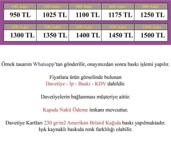Göndermiş olduğunuz bilgilerle davetiyeniz tasarlanıp size tasarım Whatapp üzerinden gönderilecektir. Onayınız olmadan davetiyeniz baskıya verilmeyecektir.