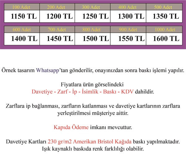 Göndermiş olduğunuz bilgilerle davetiyeniz tasarlanıp size tasarım Whatapp üzerinden gönderilecektir. Onayınız olmadan davetiyeniz baskıya verilmeyecektir.