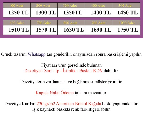 Göndermiş olduğunuz bilgilerle davetiyeniz tasarlanıp size tasarım Whatapp üzerinden gönderilecektir. Onayınız olmadan davetiyeniz baskıya verilmeyecektir.