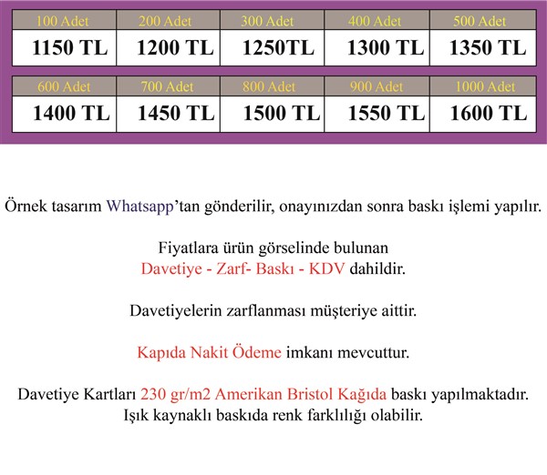 Göndermiş olduğunuz bilgilerle davetiyeniz tasarlanıp size tasarım Whatapp üzerinden gönderilecektir. Onayınız olmadan davetiyeniz baskıya verilmeyecektir.