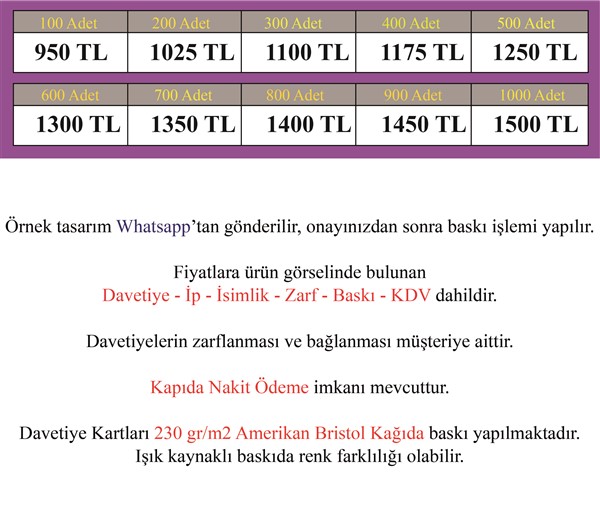Göndermiş olduğunuz bilgilerle davetiyeniz tasarlanıp size tasarım Whatapp üzerinden gönderilecektir. Onayınız olmadan davetiyeniz baskıya verilmeyecektir.
