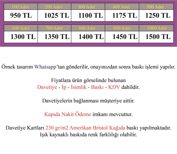 Göndermiş olduğunuz bilgilerle davetiyeniz tasarlanıp size tasarım Whatapp üzerinden gönderilecektir. Onayınız olmadan davetiyeniz baskıya verilmeyecektir.