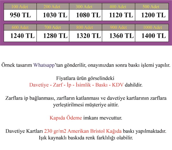 Göndermiş olduğunuz bilgilerle davetiyeniz tasarlanıp size tasarım Whatapp üzerinden gönderilecektir. Onayınız olmadan davetiyeniz baskıya verilmeyecektir.